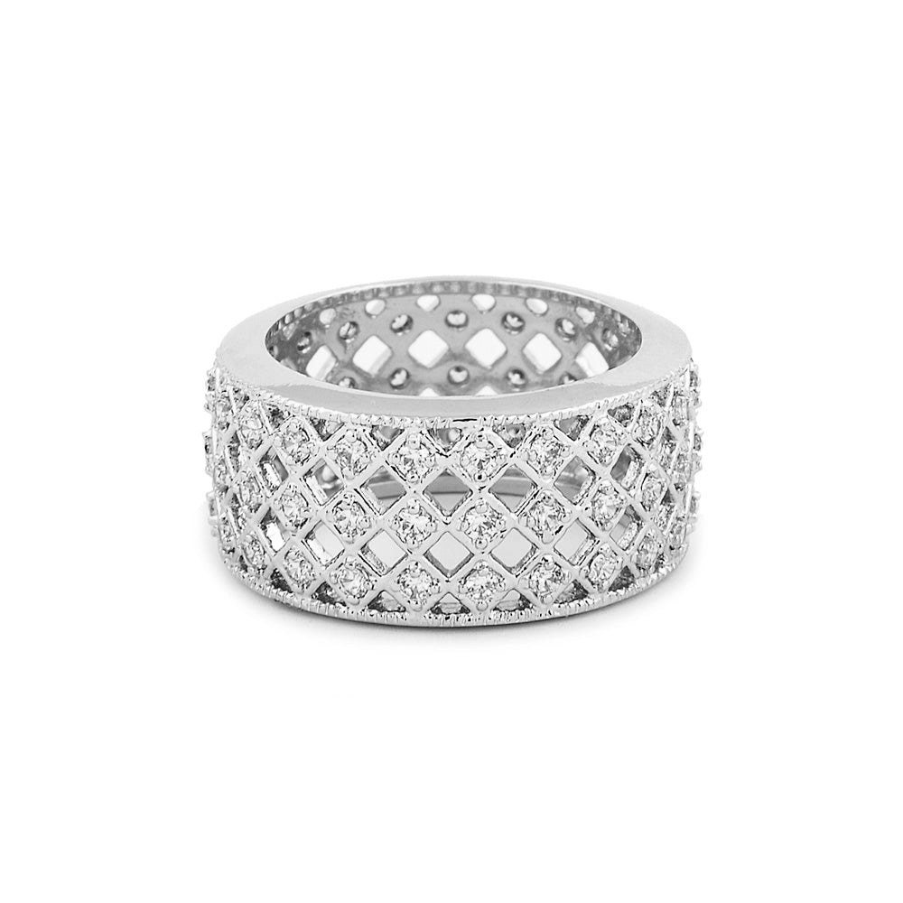 A sparkling lattice of pavé stones creates a wide-band ring that catches the light from every angle. Bold yet refined, it’s a standout piece that feels timeless.
